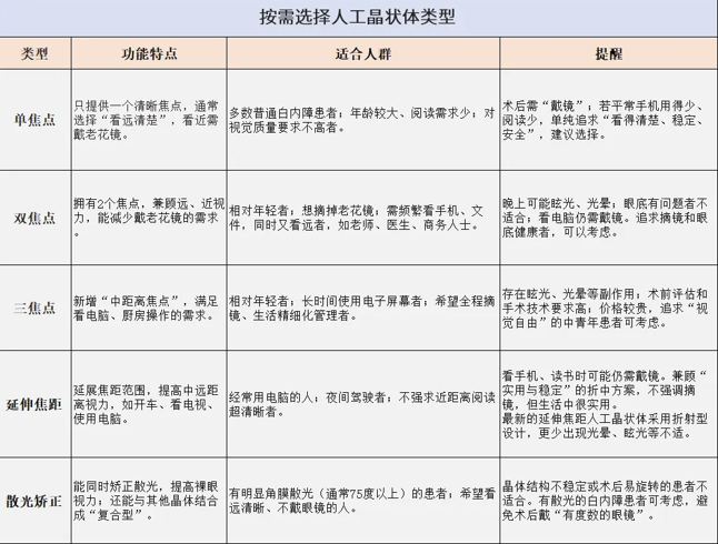 通俗提醒:如果您平常不怎么用手机、不爱看书,追求“看得清楚、稳定、安全”,单焦点人工晶状体是非常实用的选择。