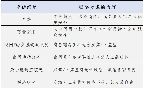 患者选择人工晶状体,不能“听别人说好”,而应根据以下几个关键因素做综合评估: