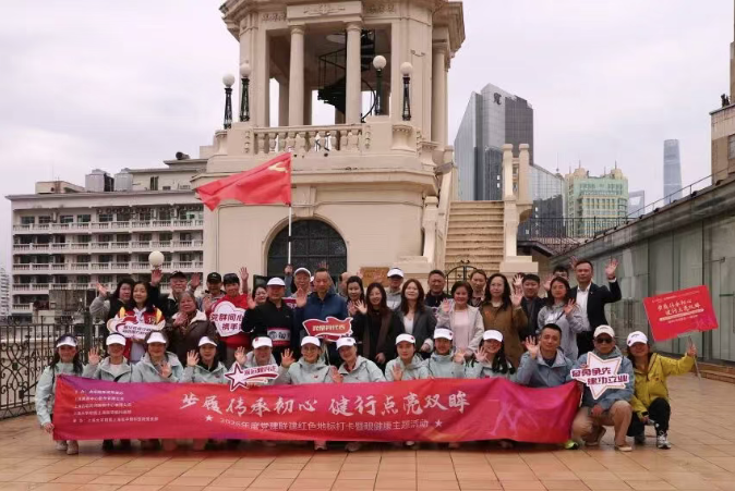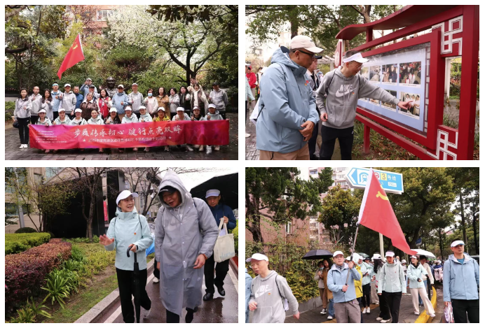 上午9时30分,随着我院胡剑徽总经理吹哨发令,健步走活动正式启程。绵绵春雨中,党员代表高举旗帜,带领参与者从百联曲阳购物中心广场出发,沿途打卡红色地标——曲苑。坐落于曲阳路街道西南小区的曲苑是一座具有典型江南风格的园林,曾留下几代党和国家领导人的视察足迹。