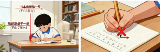 很多孩子写字时歪头、握笔时指尖距笔尖近(<2 厘米),这些不良姿势会让近视患病率大幅提高。家长要帮助孩子养成正确的读写姿势,牢记 “一尺一拳一寸” 原则: