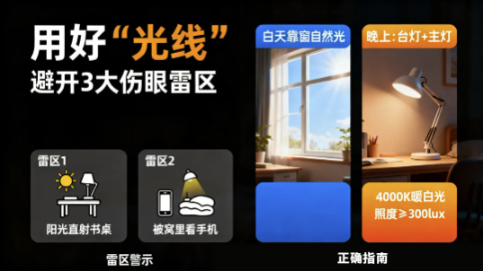 ⭕正确的做法是:白天让孩子在靠窗的位置读写,利用自然采光;晚上使用 4000K 暖白光台灯,且台灯照度要≥300lux,为孩子营造光线充足、柔和的读写环境。