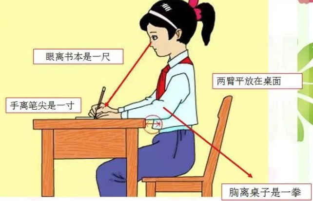 读写时保持 “一拳一尺一寸”:胸口离桌沿一拳,眼睛离书本一尺(33 厘米),握笔手指离笔尖一寸(约3厘米)。