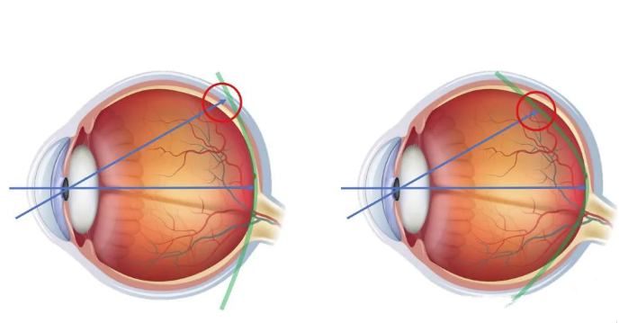 普通单光镜片:普通足矫单光镜片可以使中心视力成像焦点聚焦在视网膜上,只能矫正视力,让人戴上后看得清楚;周边成像可能会落在视网膜后边,从而对眼轴控制不利。
