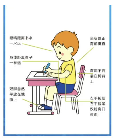 握笔时手指离笔尖1寸(约3厘米),胸口离桌子1拳,眼睛离书本1尺(约33厘米)。很多孩子近视不是因为看书久,而是姿势太近(不足20厘米)。