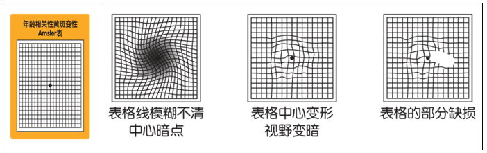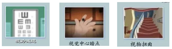 视物变形扭曲(直线看成波浪线)、中心暗点(视野中心出现暗点)或者颜色发生变化等