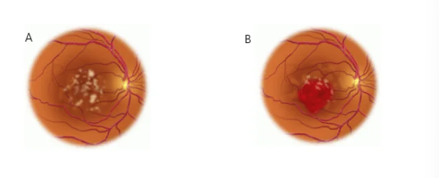 湿性又称新生血管性或渗出性黄斑变性,虽只占10%,单由于新生血管脆弱易破裂,血液成分漏出导致黄斑出血、黄斑水肿,往往造成视力迅速下降。
