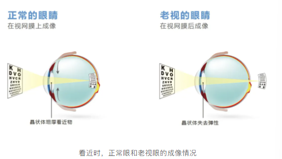 随着年龄增长,我们的晶体弹性随年龄增加下降,“镜头变焦能力”(屈光调节能力)减弱,无法将焦点关注在近处的物体,“拍照成像发散”(成像在视网膜后),这让近距离用眼时看不清楚。