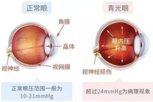 青光眼和我们的眼压密切相关。正常情况下,眼压应该在10到21毫米汞柱之间。如果眼压太高,眼球就会像胀大的气球一样,压迫到里面的视网膜和视神经,从而容易诱发青光眼,导致视力下降。