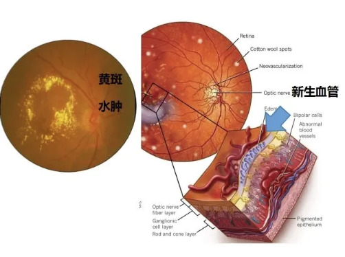 图1:糖尿病相关的黄斑水肿、新生血管