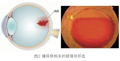 如果高糖诱导的视网膜血管损伤持续而且不断加重,那么视网膜组织的营养供应会受到进一步限制,就会发出求救信号,分泌一些促血管生长的因子,促进血管的新生。这些新长出来的血管称为新生血管(图1),新生血管不是正常的血管,它们很容易渗漏,导致视网膜出血和玻璃体积血(图2),同时牵拉周围视网膜组织,引起视网膜脱离。