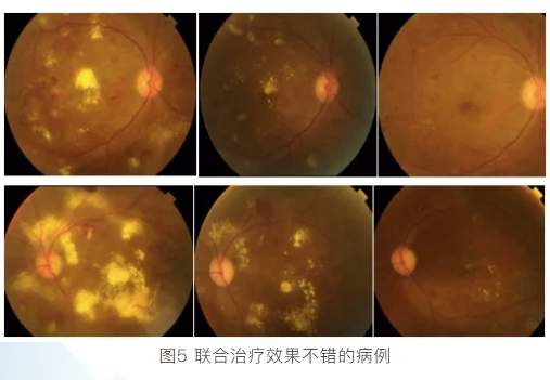 因此对于黄斑水肿的患者,需要根据眼底图像特征,制定抗VEGF适时联合恰当的抗炎或者激光治疗方案,则可以减少注射次数,较好地控制黄斑水肿的发生发展,是经济实惠、具有较好的性价比的治疗方案选择,仍然能挽救部分患者的视力(图5)。对于严重的玻璃体积血或者牵拉性视网膜脱离、持续性黄斑水肿,需要采取手术治疗。