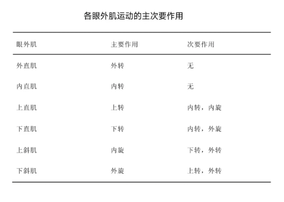 从上图各眼外肌运动的主次要作用中不难看出,内外直肌仅负责眼睛水平方向的内转和外转,相较而言上下直肌和上下斜肌控制的范围更复杂。