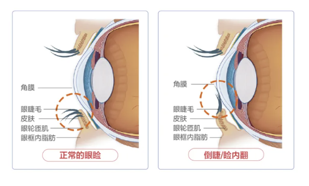 单纯倒睫:睫毛生长方向异常,或者下眼睑皮肤压迫睫毛,导致睫毛扫向角膜。